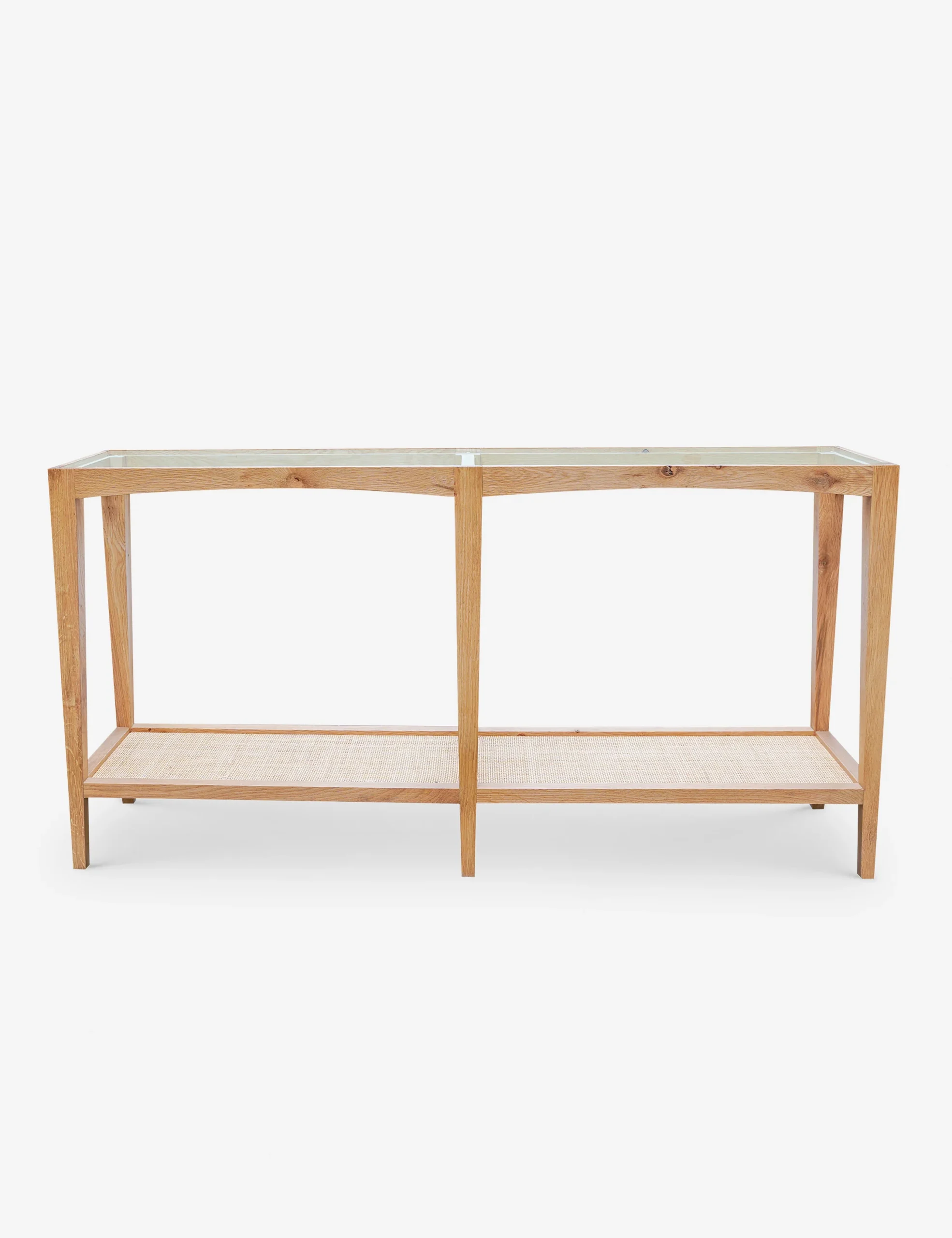 קונסולה המשלבת 3 חומרים, עץ אלון, ראטן וזכוכית
