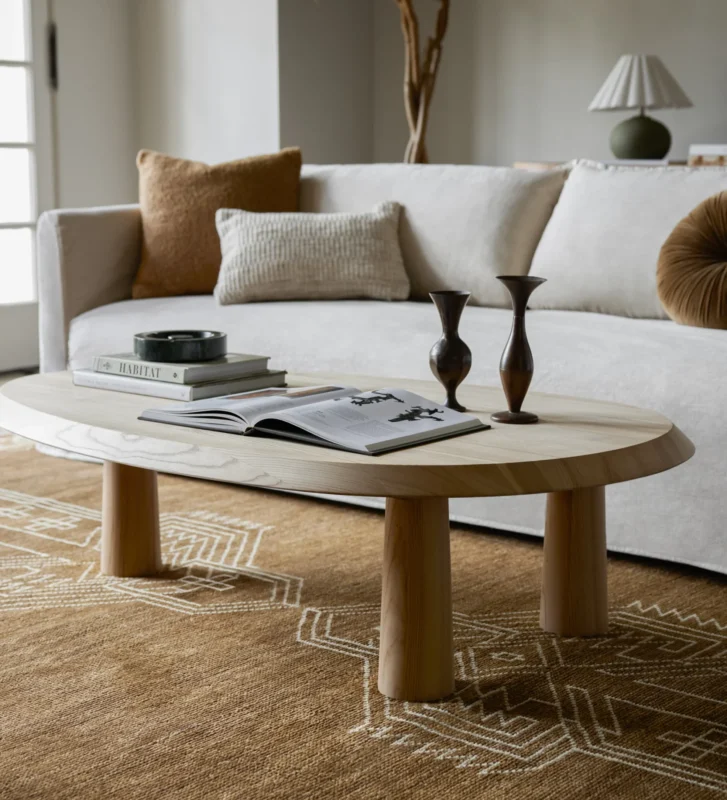 שולחן סלון מעץ אלון טבעי בגימור מחוספס.